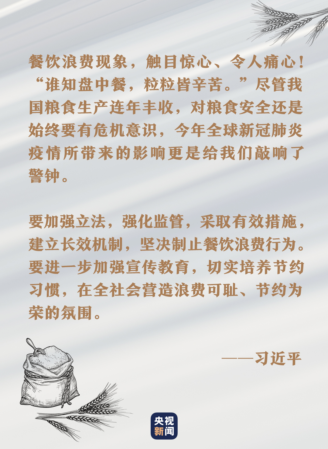 “谁知盘中餐,粒粒皆辛苦。”习近平一直高度重视粮食安全,提倡“厉行节约、反对浪费”的社会风尚,多次强调要制止餐饮浪费行为。