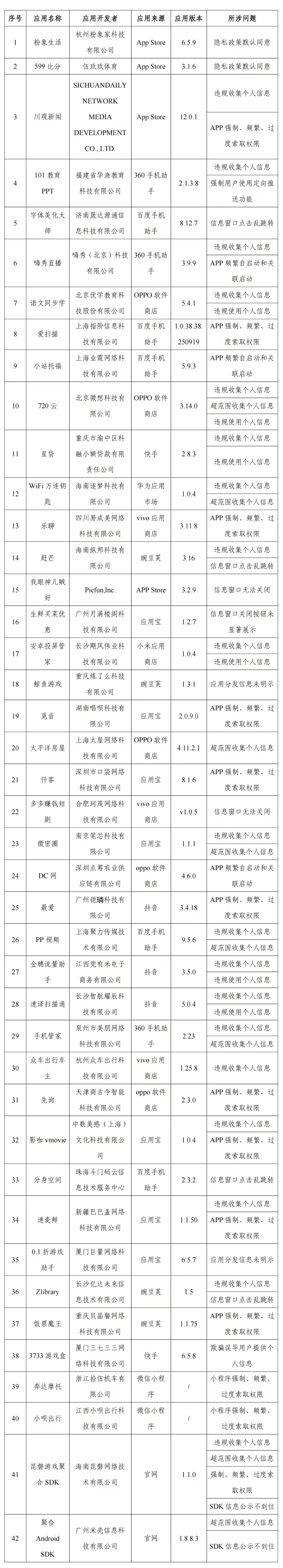 通报:工信部通报!这42款APP及SDK存在侵害用户权益行为