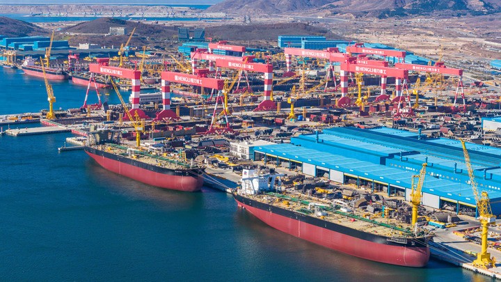 辽东湾,在长江以北中国第一大岛——大连长兴岛上,恒力重工3号船坞,5艘巨轮正在同时建造,其中2艘为30.6万载重吨的超大型原油运输船。船厂与船坞,宛如巨人。